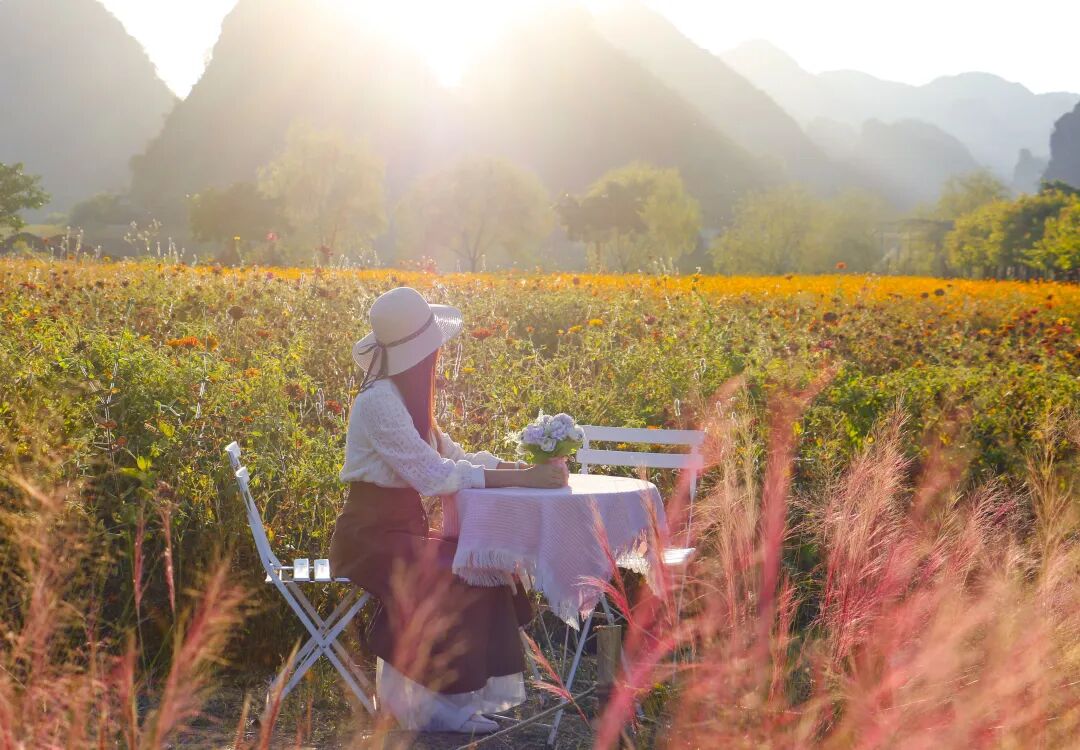 花海桌椅旁打卡拍照